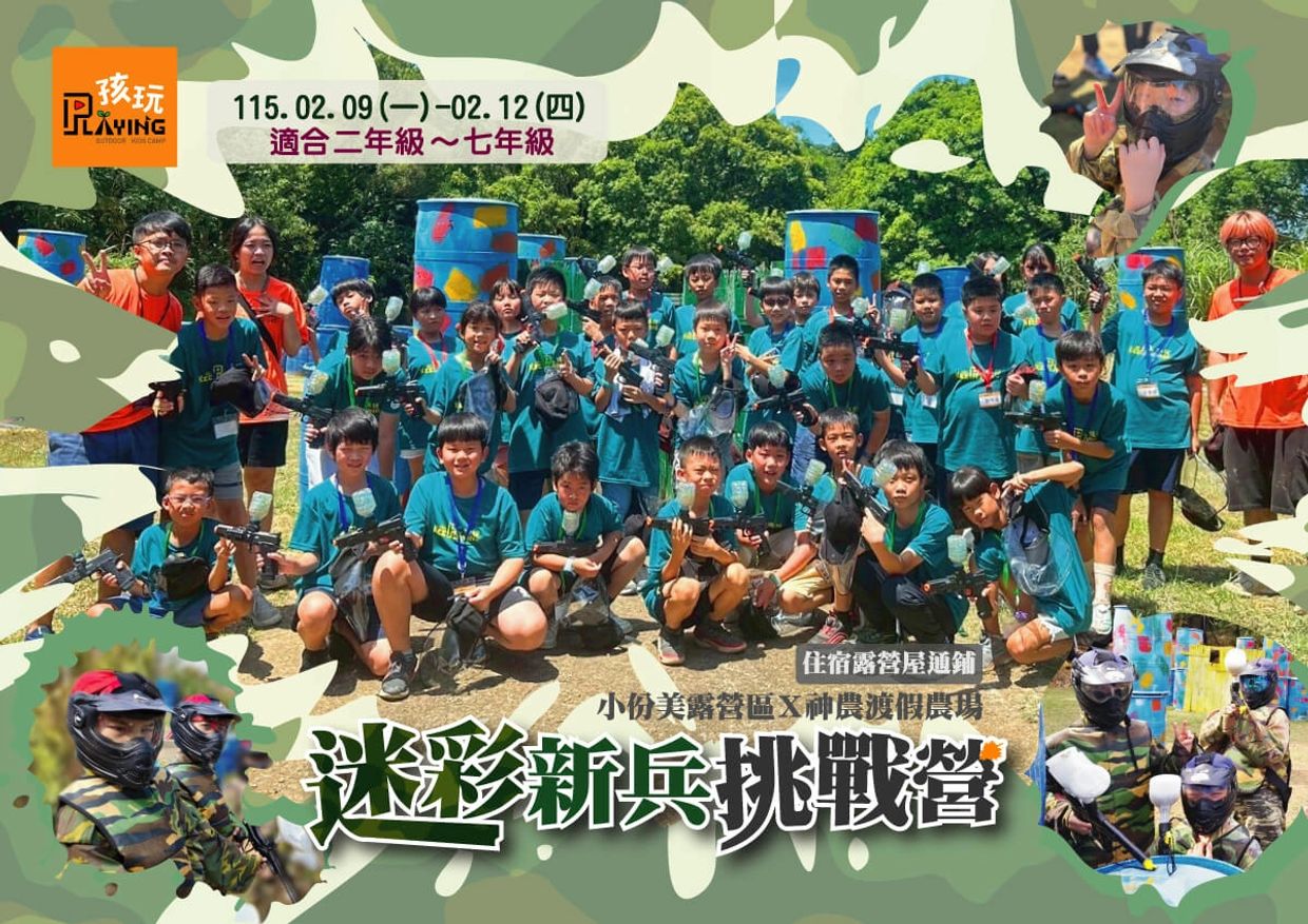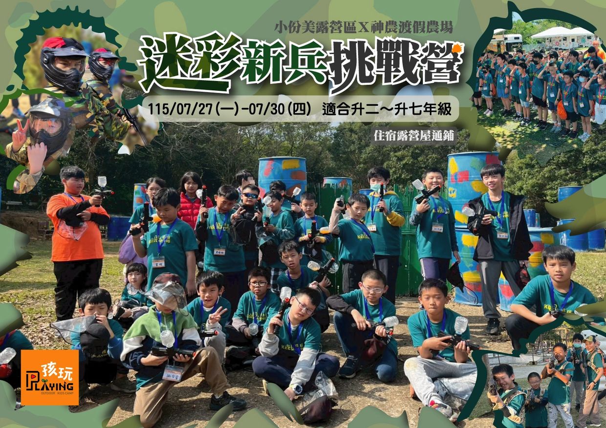 迷彩新兵營隊,讓孩子們學習團體紀律、學習生活。營隊中自己動手煮早餐、提行李、整理環境,從中培養責任感。營隊在遊戲活動的過程中融入團隊元素,也透過活動中看到每個孩子不同的性格與表現,每個孩子都不一樣,但每位孩子都是最獨特的!團體生活要學會相互尊重,試著適當表達自己的想法、在團隊的激盪下,孩子們都漸漸有所成長!離開了教室與書本,來到戶外學習的事物更多元也更精彩!